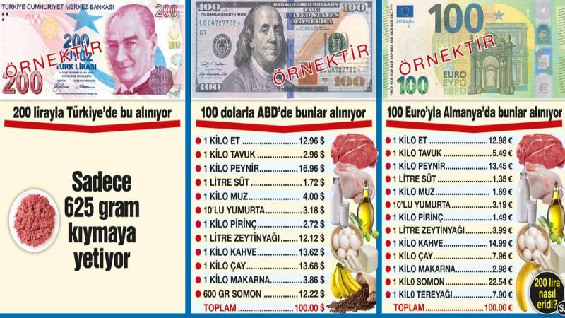 Dolar-Euro hesabıyla: O tarihte 200 lirayla 1.53 TL'den 131 dolar, 2.13 TL'den 94 Euro alınıyordu. Bugünün 200 lirası 10.5 dolar, 9.6 Euro ediyor.