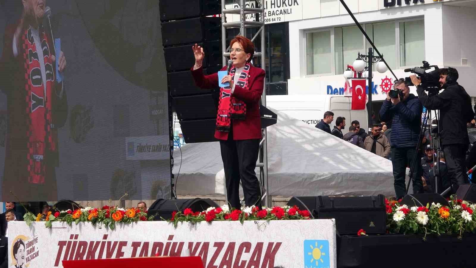İYİ Parti Genel Başkanı Meral Akşener ve Ankara Büyükşehir Belediye Başkanı Mansur Yavaş, seçim mitingi için Yozgat’a geldi. Burada vatandaşlara seslenen Akşener, millet ittifakının iktidarı kazandığı takdirde yapacakları vaatlerde bulundu. İlk işlerinin 15 Mayıstan sonra yüz bin öğretmen ataması olduğunu söyleyen Akşener, “11 bin köy okulunu hemen açacağız. Çok az bir tamiratla açılıyor. Ve bütün köylere bir öğretmen, bir ziraat mühendisi, bir veteriner ve tekniker tayin edeceğiz. Bütün çiftçilerin borçlarını yeniden yapılandıracağız. İlk bir yılı hiç ödemesiz. Ödemeyeceksiniz. İkinci yılında bir yıl faiz ödemeli, sonra beş yıl sadece anaparayı ödeyeceğiniz bir sistem kuracağız. Mazotu mutlaka indireceğiz çiftçi için. Elektrik indirim yapacağız. Yemde, mazotta ve gübrede indirim yapacağız. Yozgat’a bir tane biyogaz tesisi kuracağız. Hem elektrik üreteceğiz hem de çok ucuza biyolojik gübre dağıtacağız. Tarım yapılacak. Gençlerimizin 18-20 yaş altı grubuna ve ev kadınlarımıza şart ileri sürmeden 2 bin 500 lira aylık maaş bağlayacağız. Mülakatı kaldıracağız. Hak, hukuk, adalet diyorsunuz. Onun için hukukun üstünlüğü, yargının bağımsızlığı, demokrasi gerekir. Bunu derhal yerine getireceğiz. Haramilerin saltanatını beraber yıkacağız.” dedi.