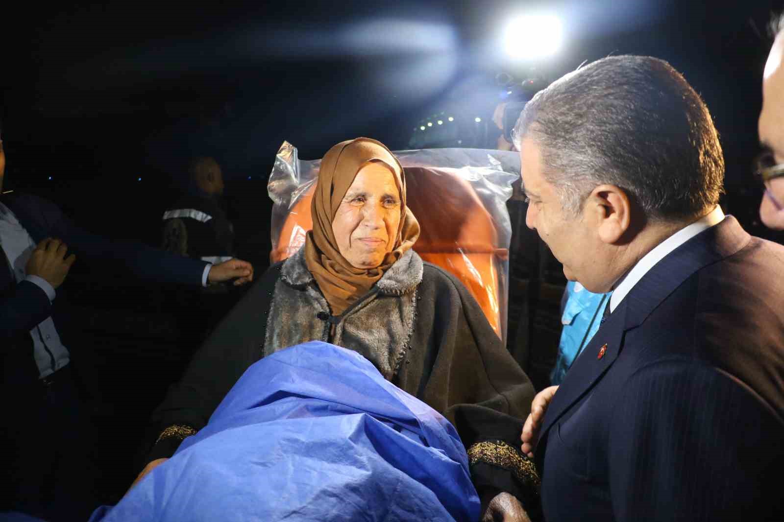 Sağlık Bakanı Fahrettin Koca, tedavi için Türkiye’ye getirilmeden önce Mısır’ın El-Ariş Havalimanı’nda karşıladığı Gazzeli hastalarla tek tek ilgilendi.