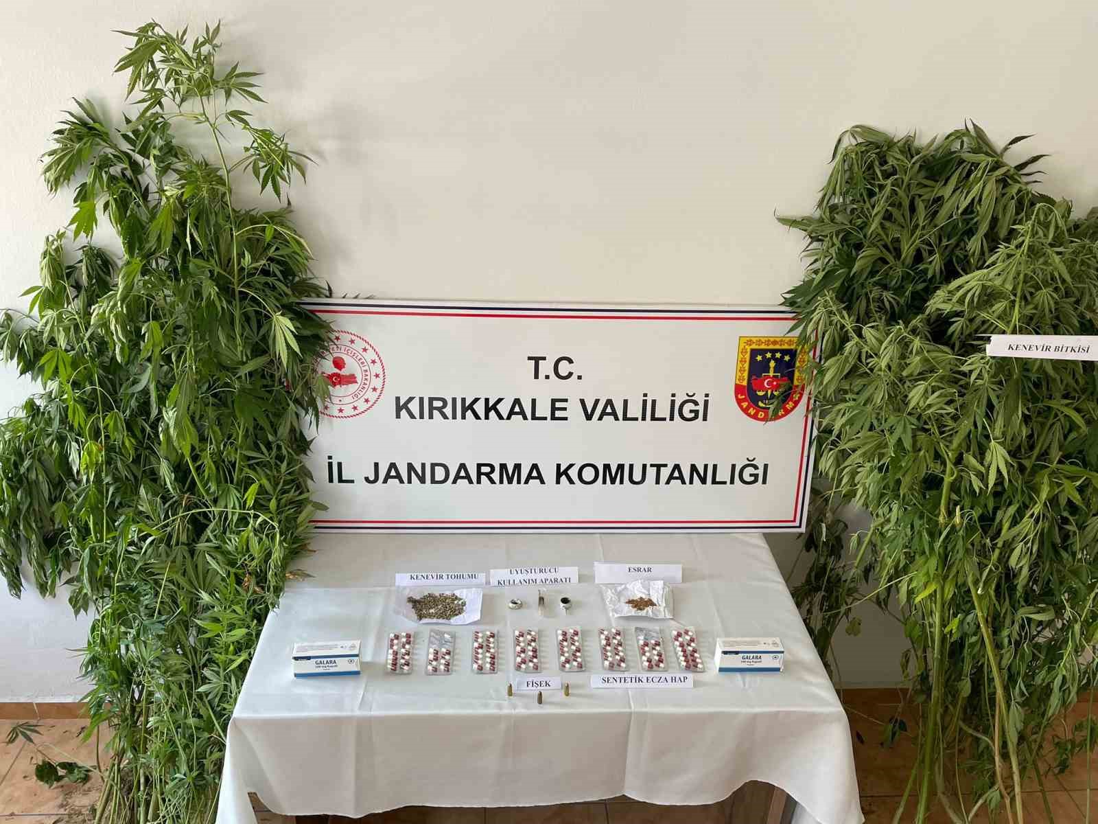 Kırıkkale’de jandarma ekiplerince bir ikamete yapılan uyuşturucu operasyonunda çok sayıda kök kenevir bitkisi, sentetik uyuşturucu hap ve esrar ele geçirildi.