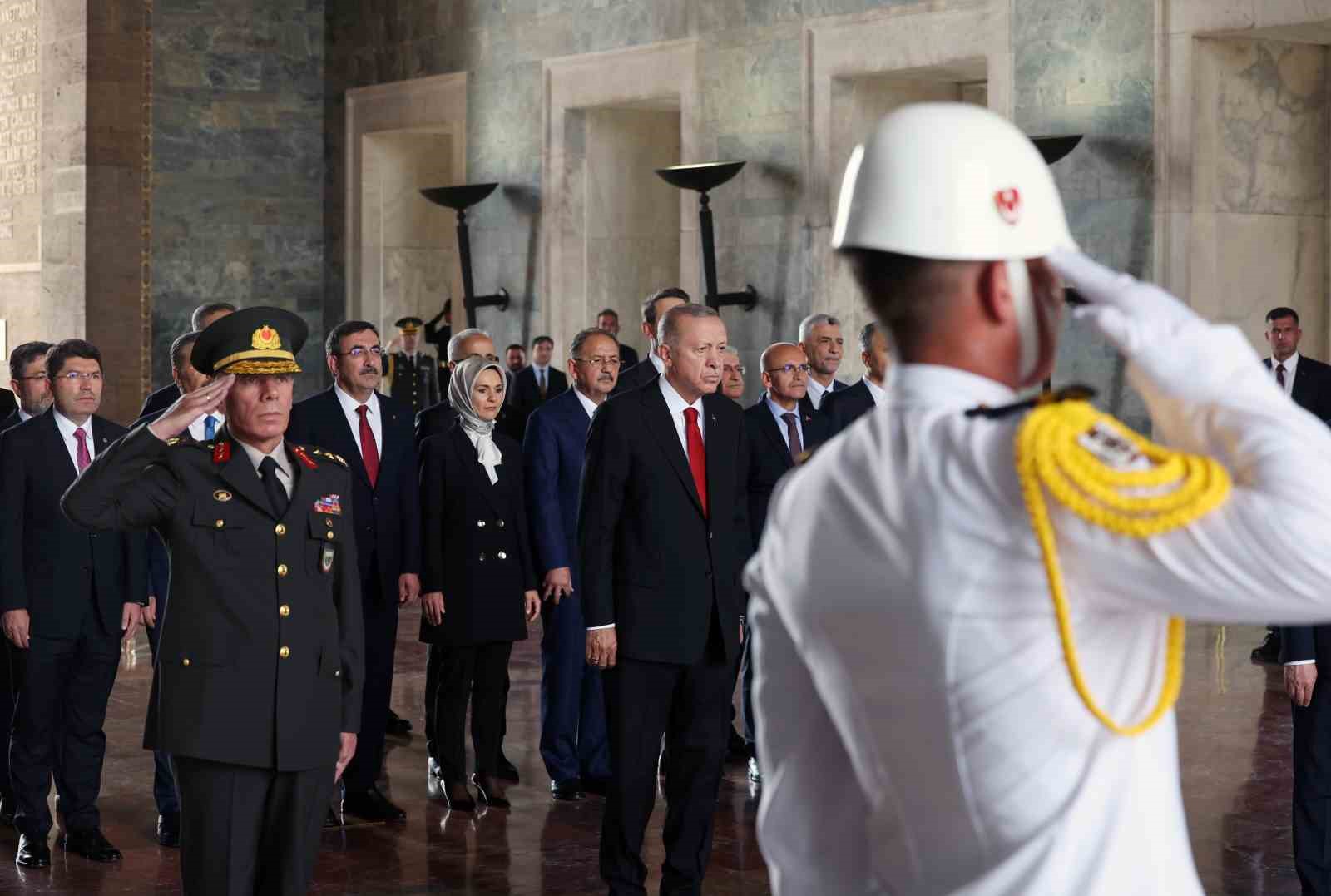 Cumhurbaşkanı Recep Tayyip Erdoğan, yeni Kabine üyeleriyle birlikte Anıtkabir’i ziyaret etti. Aslanlı Yol’dan yürüyerek Atatürk’ün mozolesine çıkan Erdoğan’a, Cumhurbaşkanı Yardımcısı Cevdet Yılmaz, Adalet Bakanı Yılmaz Tunç, Aile ve Sosyal Hizmetler Bakanı Mahinur Özdemir Göktaş, Çalışma ve Sosyal Güvenlik Bakanı Vedat Işıkhan, Çevre, Şehircilik ve İklim Değişikliği Bakanı Mehmet Özhaseki, Dışişleri Bakanı Hakan Fidan, Enerji ve Tabii Kaynaklar Bakanı Alparslan Bayraktar, Gençlik ve Spor Bakanı Osman Aşkın Bak, Hazine ve Maliye Bakanı Mehmet Şimşek, İçişleri Bakanı Ali Yerlikaya, Kültür ve Turizm Bakanı Mehmet Nuri Ersoy, Millî Eğitim Bakanı Yusuf Tekin, Millî Savunma Bakanı Yaşar Güler, Sağlık Bakanı Fahrettin Koca, Sanayi ve Teknoloji Bakanı Mehmet Fatih Kacır, Tarım ve Orman Bakanı İbrahim Yumaklı, Ticaret Bakanı Ömer Bolat, Ulaştırma ve Altyapı Bakanı Abdulkadir Uraloğlu, Cumhurbaşkanlığı İletişim Başkanı Fahrettin Altun, Cumhurbaşkanlığı Özel Kalem Müdürü Hasan Doğan da eşlik etti.
