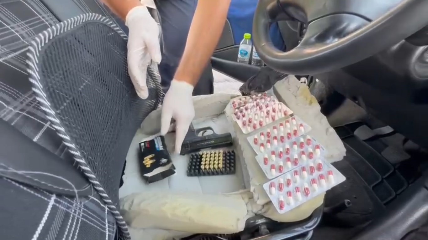 43 ilin geçiş güzergahı "kilit kavşak" Kırıkkale’de, jandarma ekiplerince yapılan yol kontrollerinde şüphe üzerine durdurulan bir otomobilin sürücü ve yolcu koltuğunda, 83 adet sentetik uyuşturucu hap ve ruhsatsız tabanca ele geçirildi.
