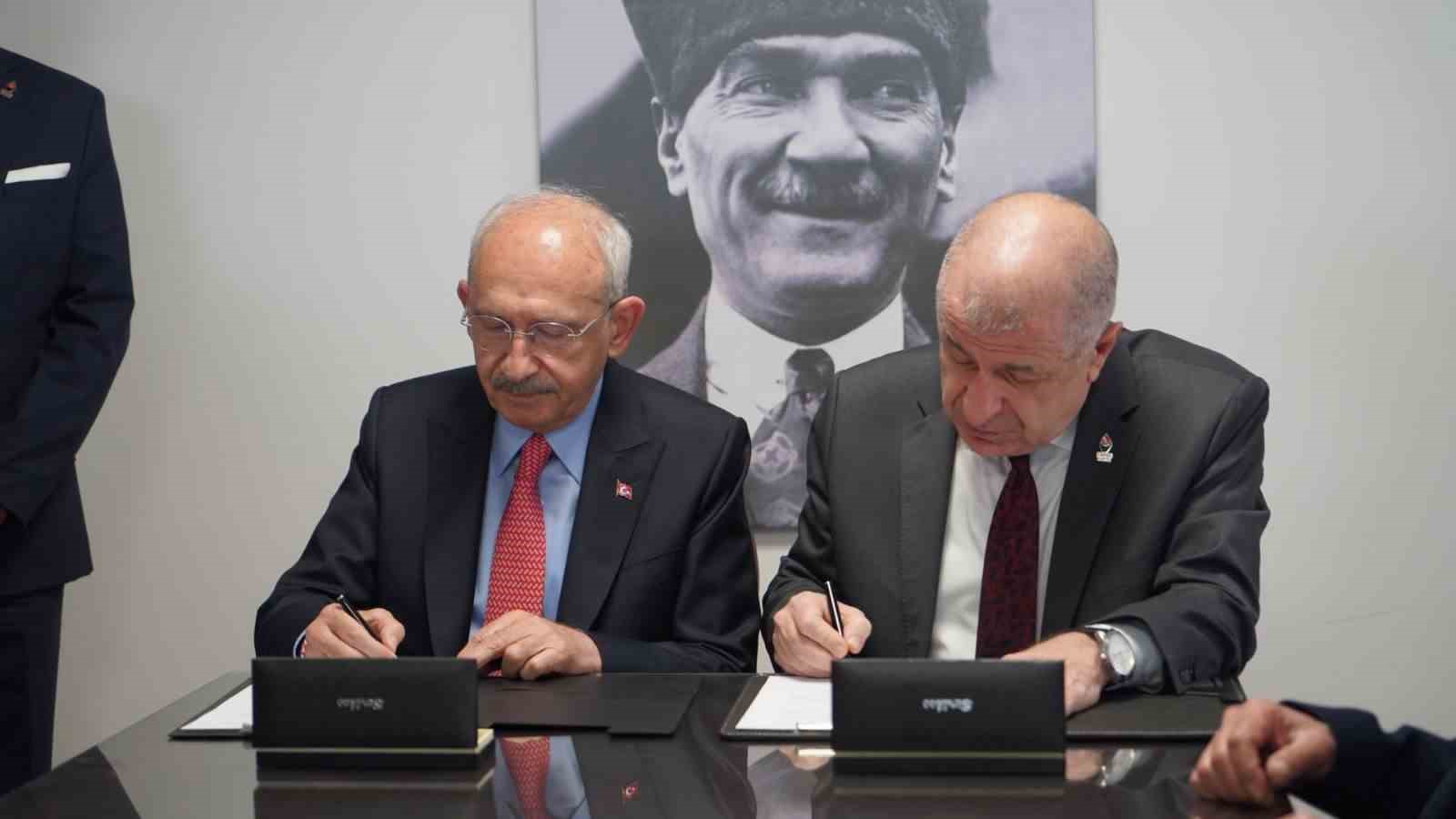 CHP Genel Başkanı Kılıçdaroğlu, Özdağ ile oldukça verimli bir toplantı geçirdiklerini belirterek, “İki genel başkan imzalı bir metin hazırladık. Türkiye’nin geleceği açısından, Türkiye’nin huzurlu bir ülke olması açısından, Türkiye’nin güçlendirilmiş parlamenter sisteme kavuşup daha sağlıklı yol yürümesi açısından her bir genel başkana, siyasi partiye sorumluluklar düşüyor. Bizler de bu sorumluluğun bilincinde bir araya geldik. Güzel sonuçlar elde edildi. Umarım çok güzel bir atmosferde seçim sonrası buluşacağız ve Türkiye’yi huzura kavuşturacak adımları atacağız” ifadelerini kullandı.